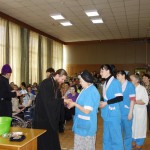 Владыка рассказал о празднике Святой Пасхи, затем окропил всех святой водой, раздал иконы и сладкие подарки.