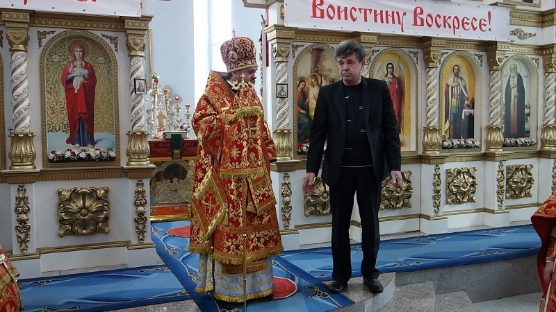 По окончании Литургии Владыка поздравил всех с праздником Пасхи, затем прихожан поздравил глава Ордынского района Колясников Владимир Игнатьевич, который также присутствовал за богослужением.