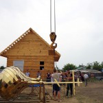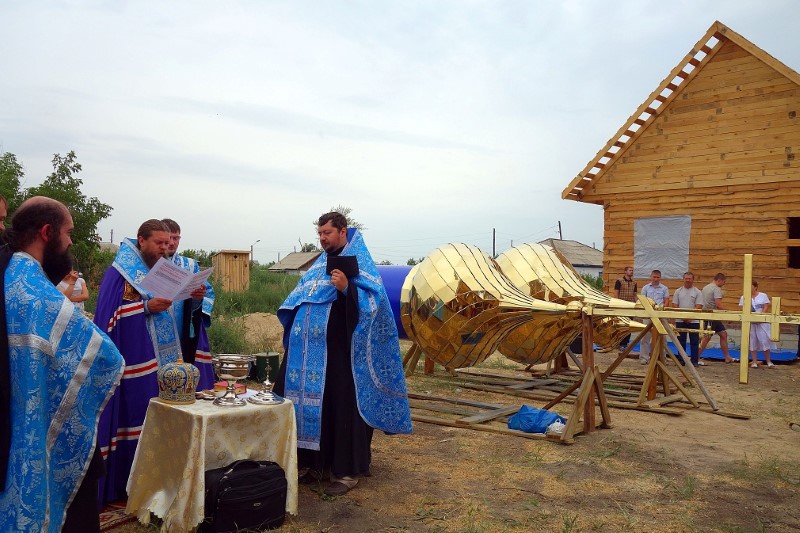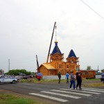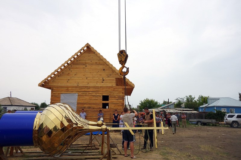 Более трехсот человек баганцев собрались для того, чтобы увидеть, как поднимают купола и кресты на храм в их селе.