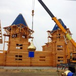 После освящения все остались смотреть, как бригада строителей и крановщик совершали поднятие куполов и крестов на здание храма.