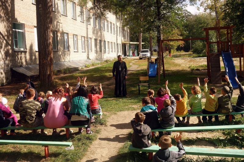 Владыка рассказал детям о православной вере. Оказалось, что сейчас здесь много новеньких детей и много из них некрещенных. Поэтому Владыка пообещал приехать сюда через месяц и совершить Таинство Крещения над всеми некрещенными детьми.