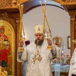 После освящения храма состоялась Божественная литургия. В проповеди по ее окончании Патриарший Экзарх всея Беларуси поздравил всех присутствующих с освящением храма на этом святом месте и зачитал послание Святейшего Патриарха Московского и всея Руси Кирилла, посвященное 1000-летию преставления св. равноапостольного князя Владимира.