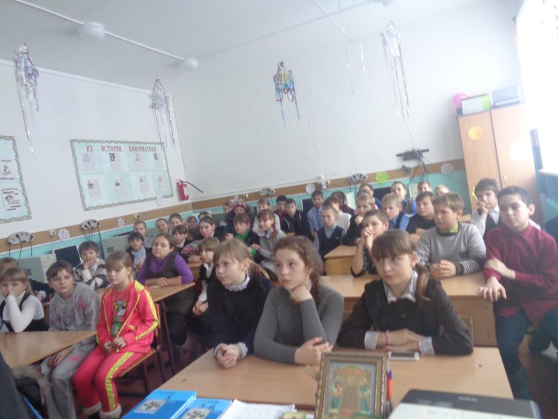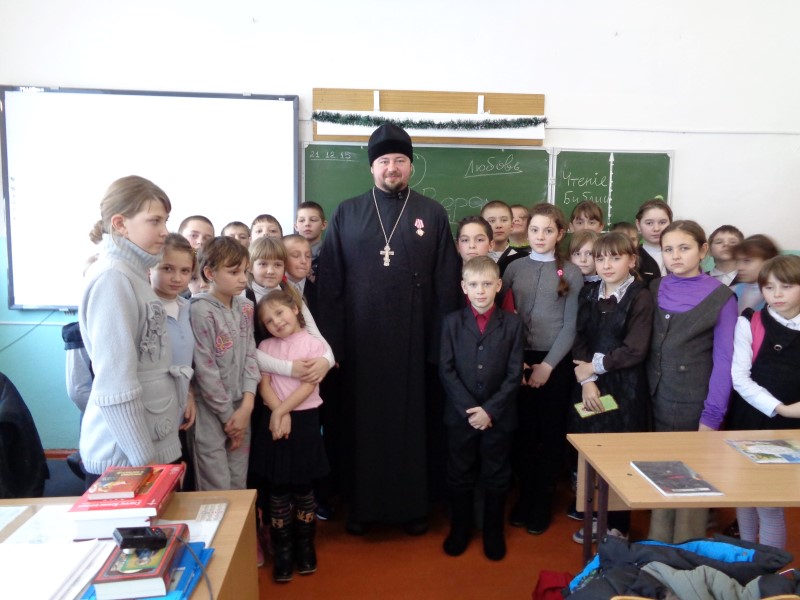 В школе отец Димитрий провел урок «добра и милосердия», на который были приглашены учащиеся 4-х, 5-х, 6-х, 7-х классов и их родители.