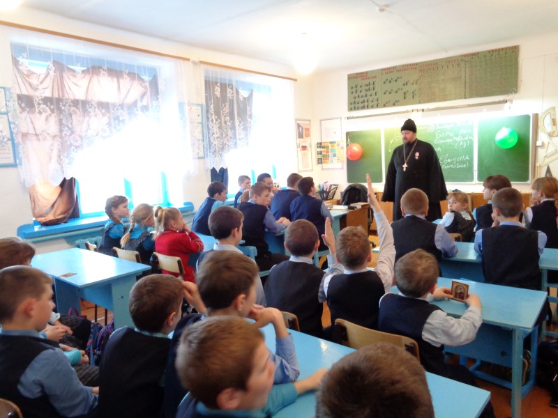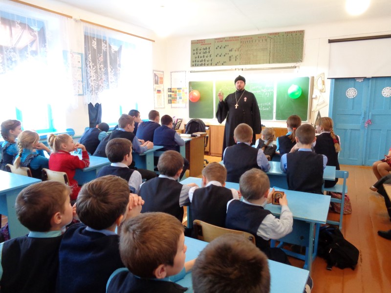 24 декабря настоятель храма в честь Успения Пресвятой Богородицы с. Багана иерей Дмитрий Мжельский посетил школу с. Вознесенки Баганского района. В школе отец Димитрий провел беседу с учащимися 5-ых—8-ых и 11-ых классов и учителями школы.