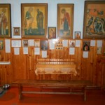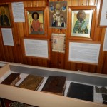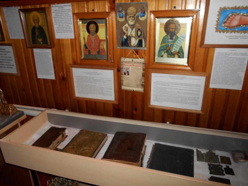 На специально устроенных столиках размещены старинные богослужебные книги, которыми, возможно, пользовались святые, а также другие святыни, собранные по всему миру.