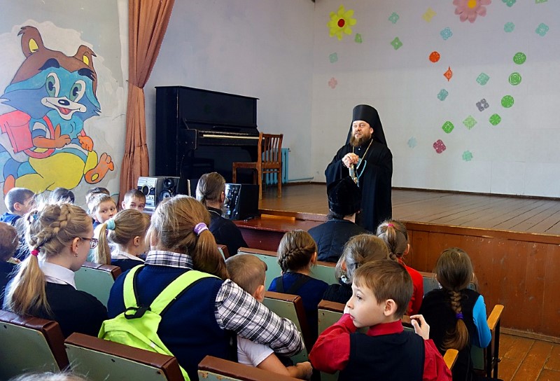 После этого правящий архиерей посетил местную школу, в которой прошла встреча с учениками. Владыка рассказал детям о вере, как надо вести себя в храме, как надо брать благословение. И напомнил, что каждый крещенный человек обязательно должен молиться и посещать храм.