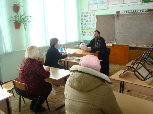 25 февраля 2016 г. в МКОУ Стеклянской СОШ состоялось родительское собрание в 3-м классе по вопросу выбора модуля ОПК в учебном курсе ОРКСЭ. На собрание пришли не только родители учащихся класса, но и заинтересованные учителя, ведь на него прибыл иеромонах Мелхиседек (Свистелин), благочинный Центрального округа Карасукской епархии.