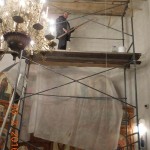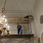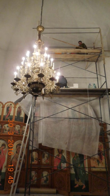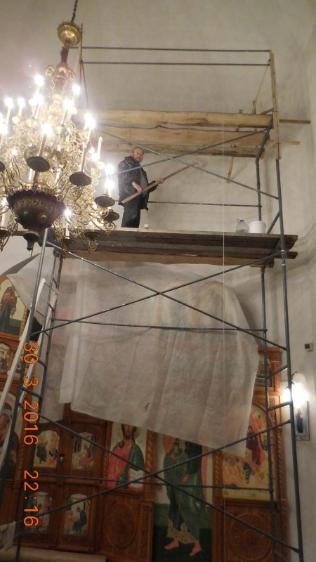 Высота нашего храма 10 метров, поэтому купол приходится белить валиком на 3-х метровом шесте на установленных лесах.