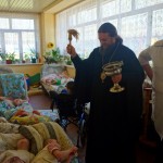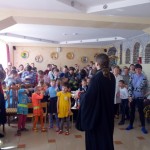 Епископ Филипп говорит, что на все эти встречи с детьми он всегда приезжает со святой водой и что нужно стараться не только вручить детям подарки, но нужно обязательно покропить всех святой водой, т. к. при окроплении детей святой водой на них сходит Божия благодать.