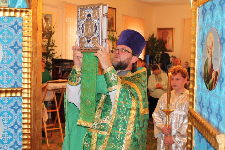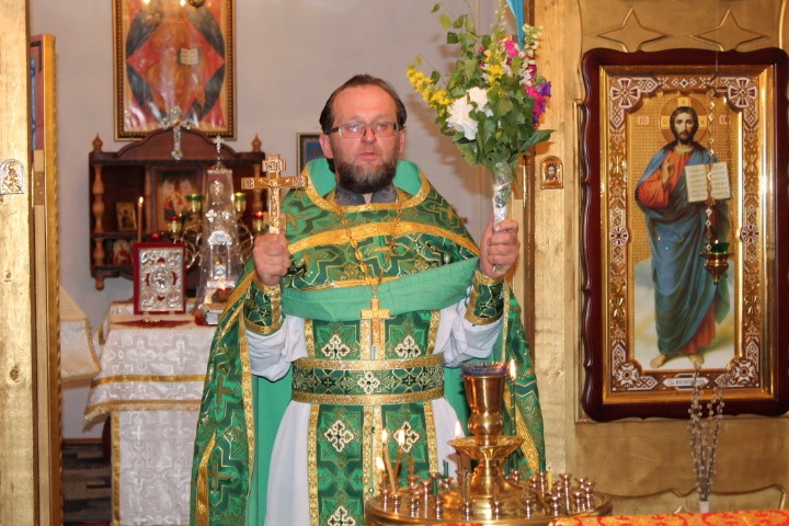 По окончании Литургии была совершена великая Троицкая вечерня с чтением коленопреклоненных молитв, за которой отец Евгений и прихожане в первый раз после светлых Пасхальных дней преклонили колени, чтобы вместе прочесть и выслушать необыкновенно красивые и глубокие по содержанию молитвы этого дня.