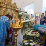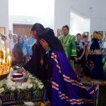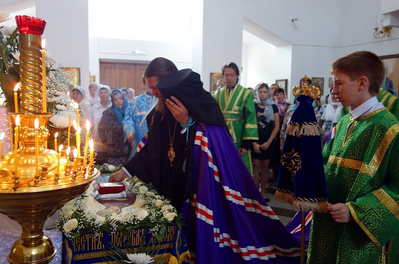 По окончании Литургии Владыка приложился к плащанице Пресвятой Богородицы, которая накануне на всеобщем бдении была вынесена на середину храма и которая всегда в этот праздничный день по традиции украшена живыми белыми цветами.