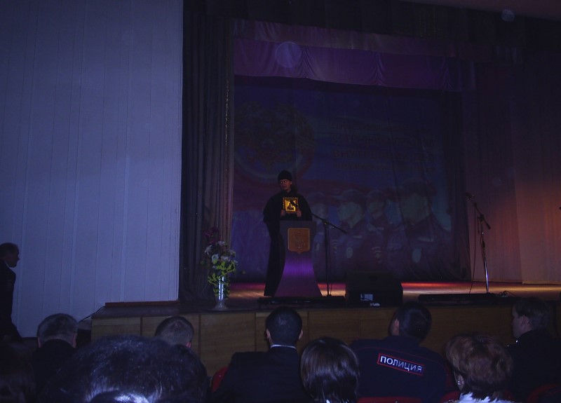 По благословению Преосвященнейшего Владыки Филиппа после традиционного праздничного молебна, посвященного профессиональному празднику, на концерт прибыли иерей Николай Иванов и иерей Константин Карамышев. Священники поздравили сотрудников органов и ветеранов с праздником и пожелали им помощи Божией в их нелегком труде, а также подарили Казанскую икону Божией Матери.