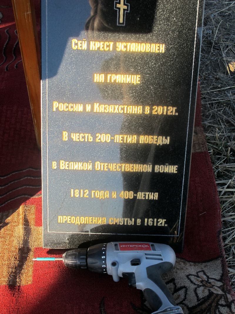 На памятной плите, установленной в основании Поклонного Креста — табличка с надписью: «Сей Крест установлен на границе России и Казахстана в память 200-летия победы России в Отечественной войне 1812 г. и 400-летия окончания Великой смуты в 1612г.».