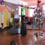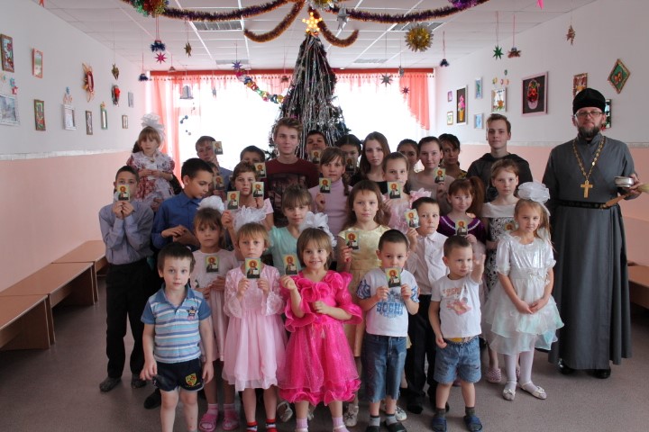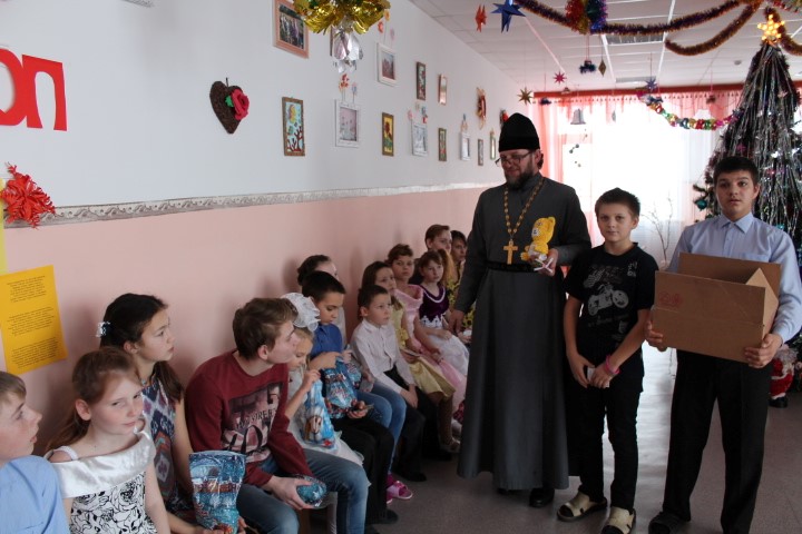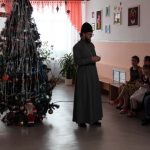 Батюшка поздравил детей со светлым праздником Рождества Христова, рассказал им о событиях той далекой рождественской ночи, окропил всех святой водой, подарил на память иконочки Спасителя и вручил мягкие игрушки и сладкие подарки.