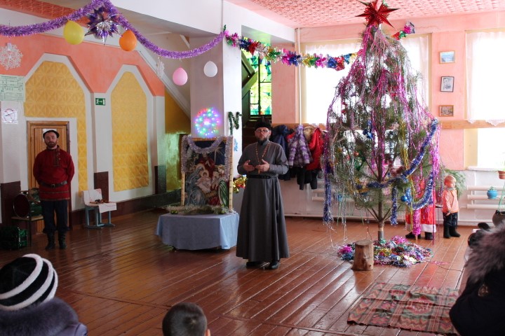А по окончании Божественной литургии в местном Доме культуры состоялось торжественное рождественское представление, организованное приходом храма. Перед его началом на сцене Дома культуры протоиерей Евгений Зверев поздравил всех со светлым праздником Рождества Христова и рассказал гостям об истории этого великого праздника.