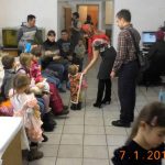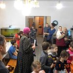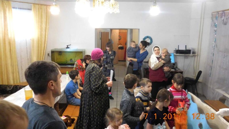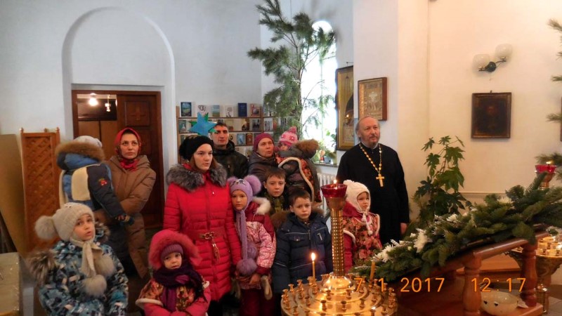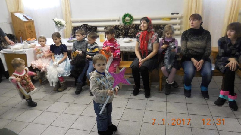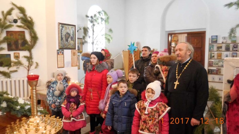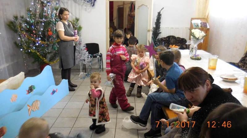 Дети читали рождественские стихи, а матушка Надежда задавала им вопросы и загадки на тему праздника. Потом дети удочкой вытащили из самодельного моря, изготовленного к празднику Рождества, сундук с подарками. Подарков хватило на всех!