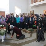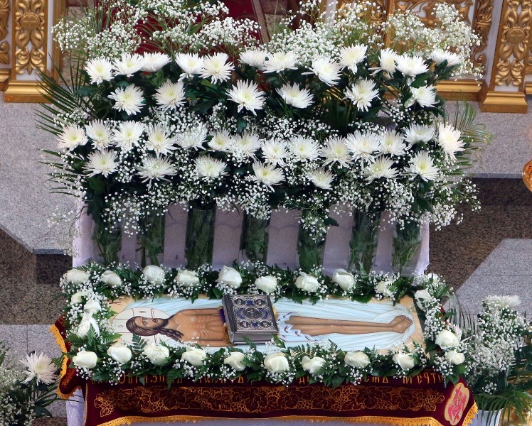 После чтения «Отче наш» во время пения тропаря Великой Субботы «Благообразный Иосиф, с древа снем Пречистое Тело Твое, …» Плащаницу вынесли на середину храма и положили на возвышенное место, украшенное цветами.