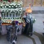 По завершении проповеди прихожане коленопреклоненно приложились к Плащанице и лежащему на ней Евангелию.