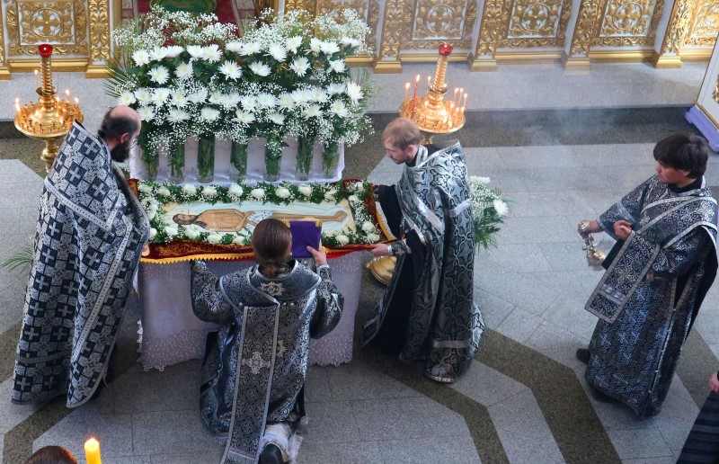 По его окончании Владыка обратился к молящимся с архипастырским словом, отметив, что этот канон — главный момент богослужения: здесь и страдания Господа Иисуса Христа, и его распятие, и крестная смерть и погребение.