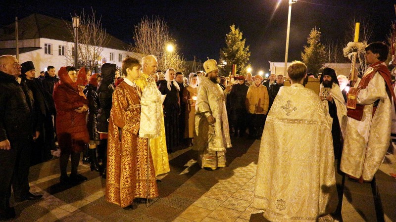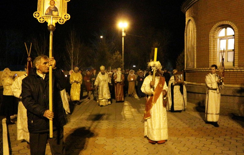 В полночь во мраке и тишине ночи с пением стихиры «Воскресение Твое, Христе Спасе, Ангели поют на небесех…» начался крестный ход с хоругвиями, который под пасхальный колокольный звон обошел вокруг собора и остановился у затворенных западных врат. Торжественным возгласом: «Слава Святей, и Единосущней, и Животворящей, и Нераздельной Троице…!» началась пасхальная заутреня, где впервые прозвучало радостное восклицание: «Христос Воскресе!».