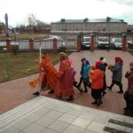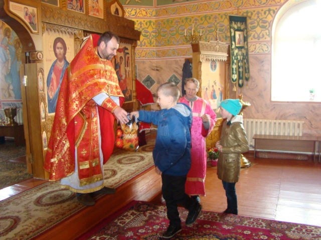 По окончании пасхальной вечерни учащимся воскресной школы иеромонах Мелхиседек вручил пасхальные подарки.