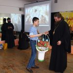 А Владыка уже приглашает детей, чтобы они подходили за подарками: раздает всем детям на память сладкие пасхальные подарки и иконочки.