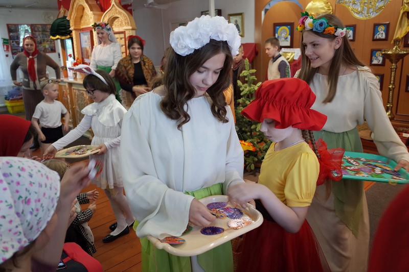 Задолго до Пасхи участники готовили для ВСЕХ прихожан свои простые и милые подарки — нарисованные пасхальные яички. И подарили их всем зрителям. Радостно это — дарить свой труд, и ребята смогли это почувствовать.