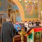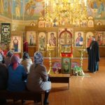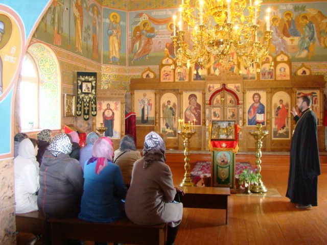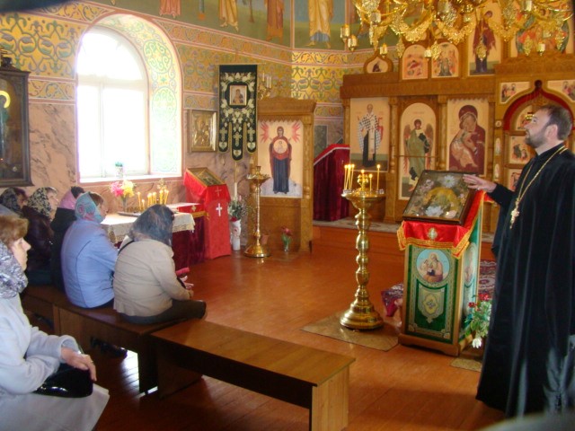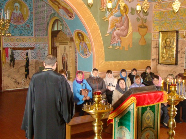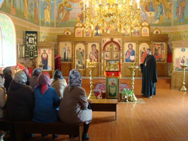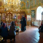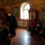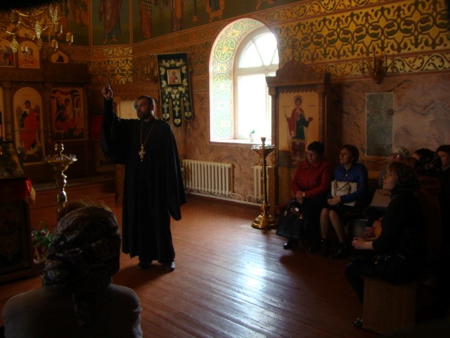 По окончании беседы иеромонах Мелхиседек ответил на вопросы присутствующих учителей и провел экскурсию по храму, в котором полтора месяца назад была завершена роспись храмовых стен.