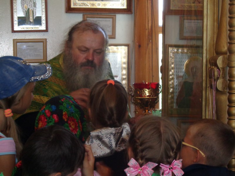 Батюшка позаботился и о максимальном низведении благодати Пресвятого Духа на эти милые ангелоподобные существа всеми доступными способами: ребятишек покадил, обильно окропил святой водой, было много визга, научил правильно креститься и вместе с ребятами совершил краткий молебен, ребята приложились к чудотворной иконе и были помазаны освященным маслом из неугасаемой лампадки. Проводил батюшка ребятишек благодатным колокольным звоном. Надо отметить, что в день совершения экскурсий храм был еще празднично украшен цветами, березовыми веточками и лежащей на полу зеленой травой.