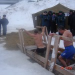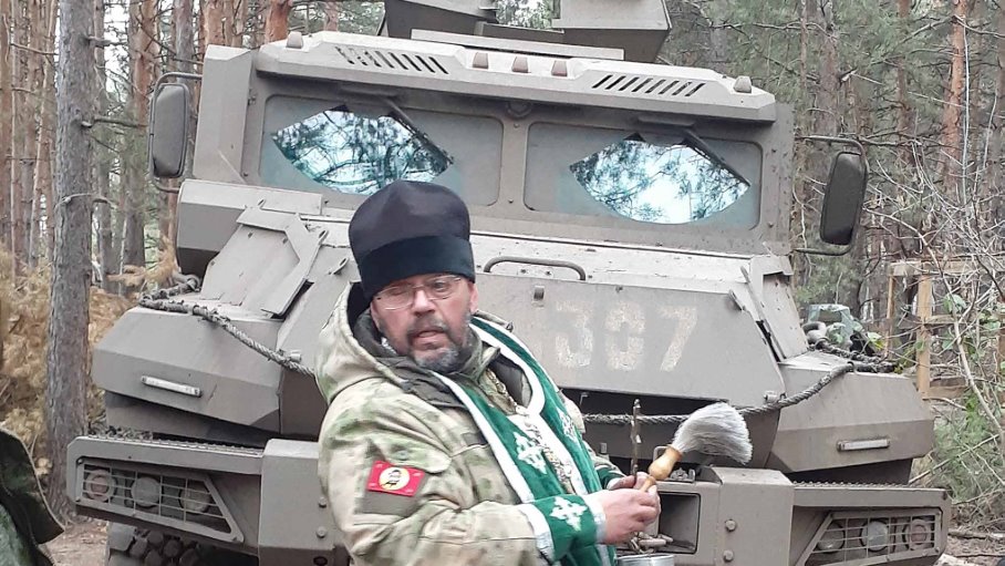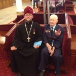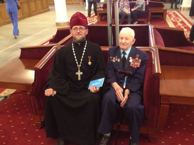 Перед началом торжественного собрания иерей Евгений Зверев пообщался в фойе театра с Героем Советского Союза Александром Яковлевичем Анцуповым, ныне проживающим в Коченевском районе, участником Великой Отечественной войны с 1943 г., получившим боевое крещение в боях на Орловско-Курской дуге, трижды раненым в военные годы.