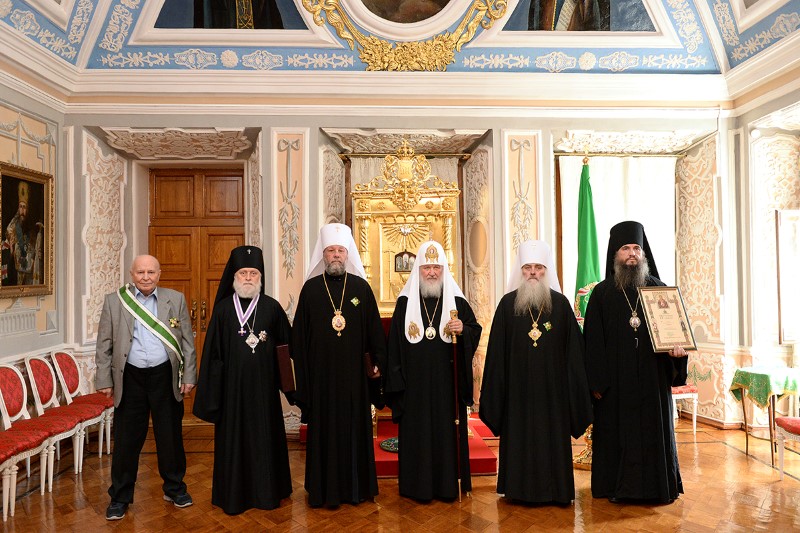 Затем в Патриарших покоях Лавры Предстоятель Русской Церкви вручил награды архиереям, отмечающим в этом году юбилейные даты.
