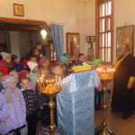 Настоятель храма иерей Сергий Гранкин дружелюбно встретил ребят, рассказал о внешнем и внутреннем устроении храма, об устройстве иконостаса, о православных иконах, научил ребятишек правильно креститься, ученики зажгли свечи и при заженных свечах был совершен краткий молебен перед чудотворной храмовой иконой «Неопалимая Купина».