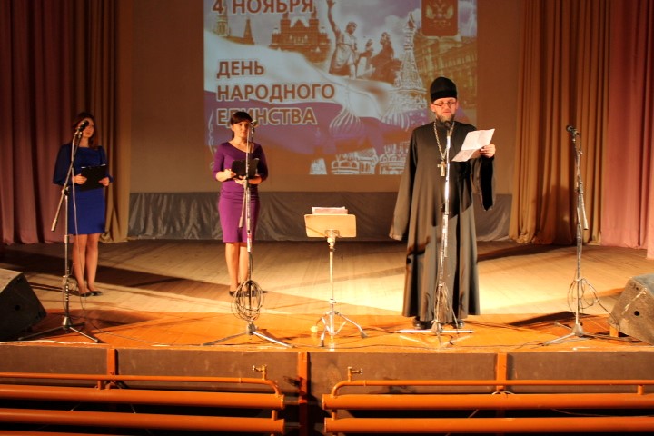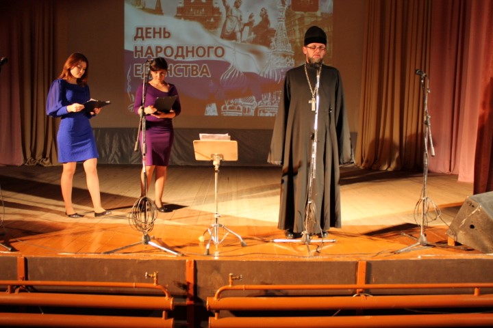 Протоиерей Евгений Зверев, настоятель Успенского храма с. Половинного, со сцены Дома культуры поздравил всех собравшихся с памятным днем Российской истории, вкратце напомнив об истории церковно-государственного праздника, и пожелал всем здоровья, сил и такого же единения и любви к Богу и Отечеству, какие имели наши предки.