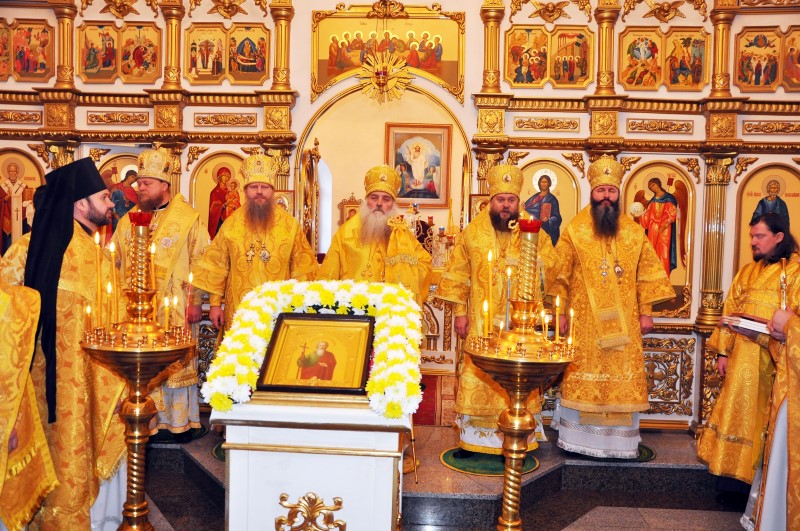 В завершение своего святительского слова митрополит Сергий преподнес дар в благословение собору св. Андрея Первозванного на молитвенную память икону святителя Макария, митрополита Московского и Алтайского.