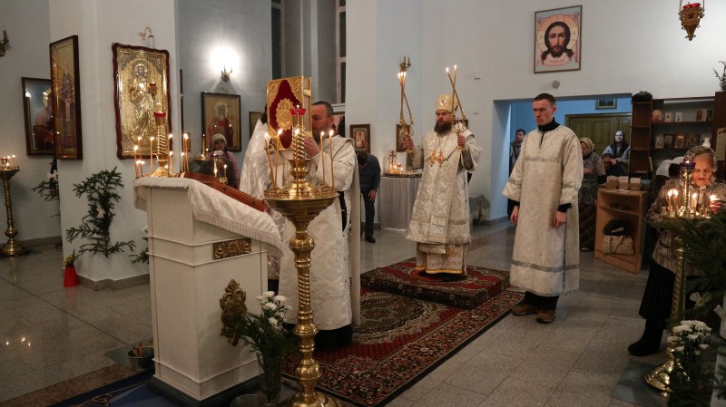 В приветственном слове по окончании богослужения Владыка поздравил всех с воскресным днем и отметил, что в это последнее воскресенье перед Рождеством Христовым Святая Церковь вспоминает и прославляет ветхозаветных святых, от племени которых по Своему человечеству произошел Господь Иисус Христос. Поэтому за Божественной Литургией было прочитано Евангелие от Матфея, содержащее родословную Христа. Родословная эта начинается именами великих ветхозаветных праведников Авраама, Исаака и Иакова и заканчивается именем святого праведного Иосифа, которому была обручена, вручена под его покровительство Дева Мария, Матерь Божия.