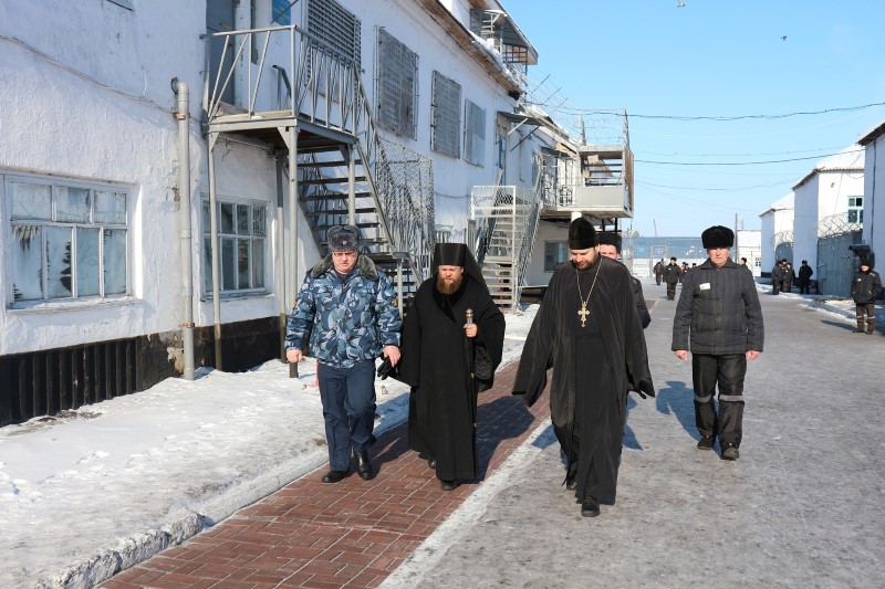 Затем Владыка со священнослужителями посетил отряды, в которых отбывают срок заключения более 1000 осужденных, кратко побеседовал со всеми и пожелал помощи Божией и спасения души.