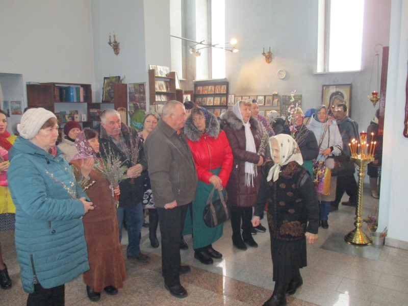 Прихожане собора исповедовались и причастились Христовых Тайн. В завершении Литургии после заамвонной молитвы по традиции были освящены вербы.