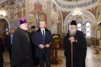 Владыка Тихон и Андрей Александрович после рабочей встречи в здании Правительства Новосибирской области совершили объезд нескольких православных храмов, первым их которых стал Александро-Невский собор. Священнослужители и прихожане собора встретили Владыку и губернатора хлебом-солью.