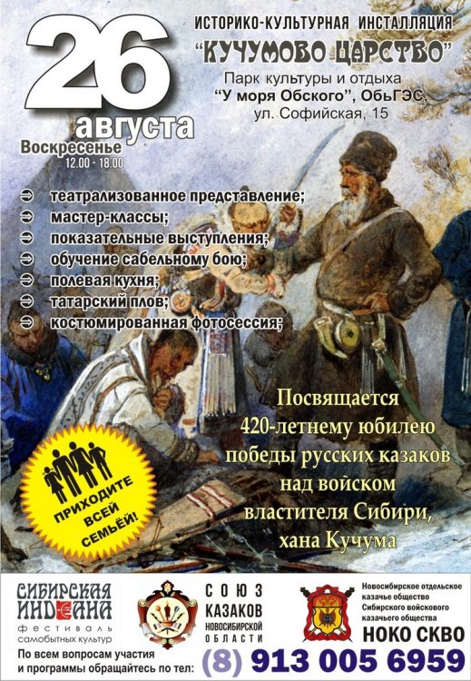 26 августа 2018 года в парке “У моря Обского” (ОбьГЭС, ул. Софийская,15 ) состоится большая культурная программа, посвященная 420-ой годовщине Ирменского сражения. Предполагается, что в реконструкции исторического сражения казаков дружины Воейкова и войска хана Кучума примут участие более 200 человек из казачьих и молодежных патриотических организаций Новосибирска и области.