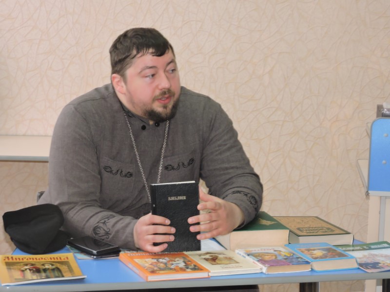 Беседа со школьниками была посвящена Дню православной книги. Батюшка рассказал о главной книге христиан — Библии, о роли духовных книг в жизни человека и становлении личности.