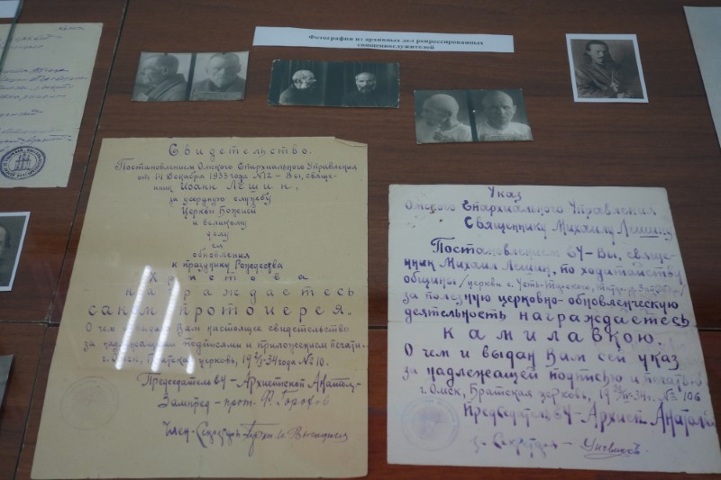 — фотографии и документы предположительно 18-ти священнослужителей, останки которых были обретены в с. Волчанке Доволенского района и перезахоронены в с. Довольном;