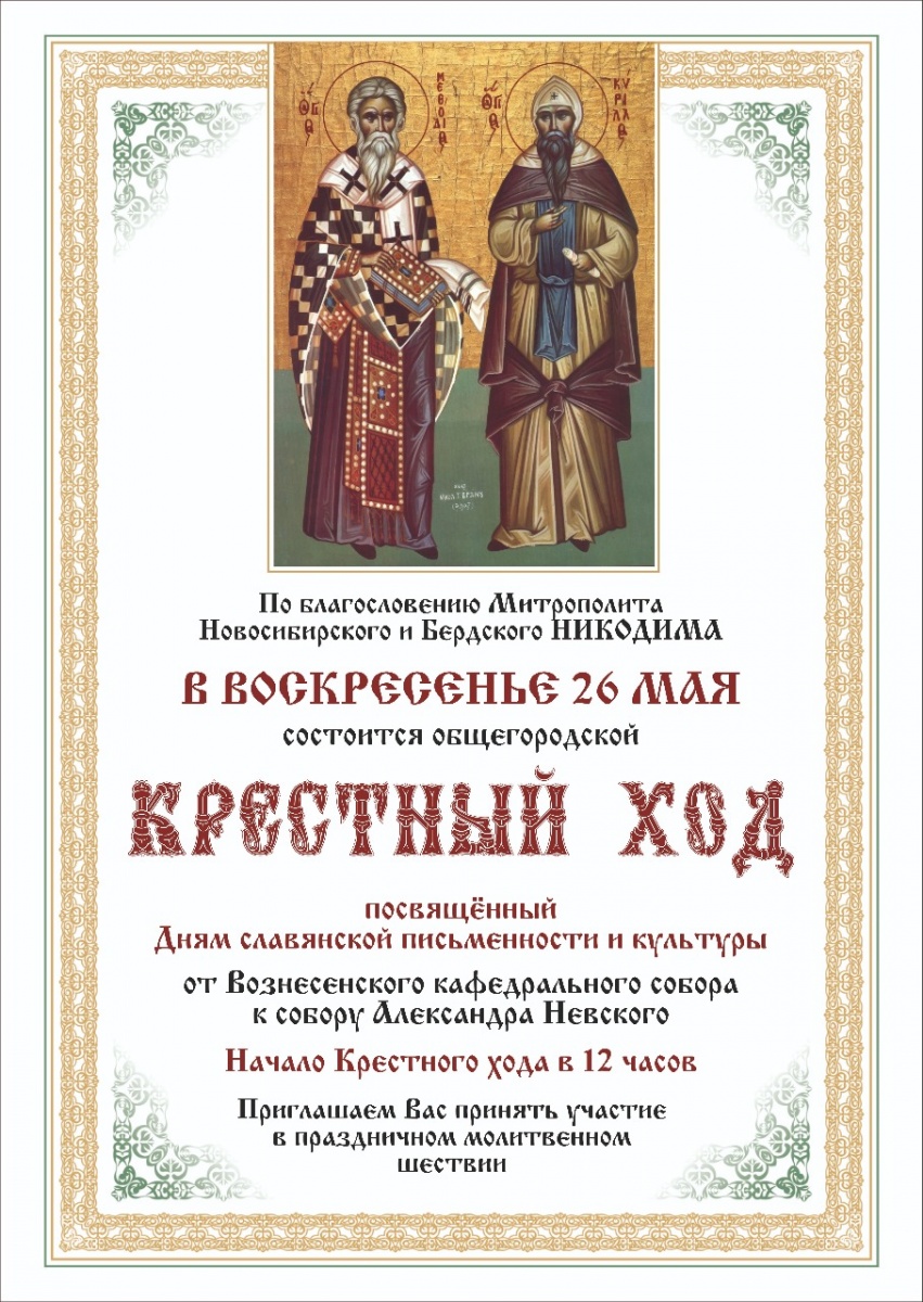26 мая состоится общегородской крестный ход 26 мая по благословению митрополита Новосибирского и Бердского Никодима состоится традиционный общегородской крестный ход. Шествие начнется в 12.00 от Вознесенского кафедрального собора и завершится у Александро-Невского собора г. Новосибирска.