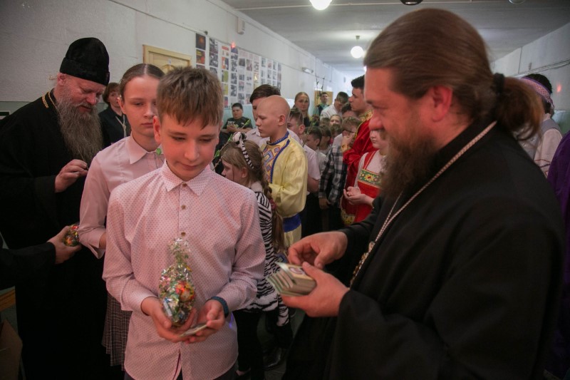После концерта Владыки поздравили воспитанников школы-интерната с праздником Святой Пасхи и пожелали им, чтобы они всегда делились друг с другом радостью и любовью, которые дарит им Господь, и чтобы в их сердцах всегда горел Благодатный огонь, согревая теплом и радостью Светлого Христова Воскресения.