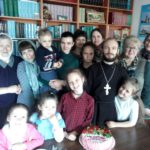 Перед трапезой батюшка совместно с детьми совершил краткий молебен и пригласил всех нас на чаепитие с вкусными блинчиками, тортом «Черепахой», с такой любовью приготовленными матушкой.