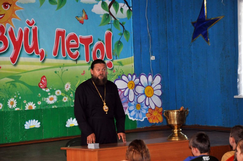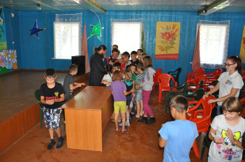 В этот день состоялась встреча епископа Филиппа с сотрудниками и детьми лагеря. Владыка рассказал о православной вере, об истории разрушенного храма и о праздновании Почаевской иконы Божией Матери.