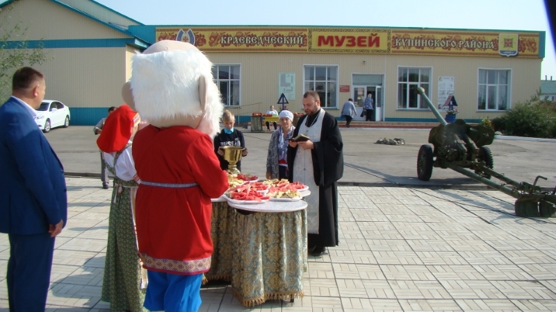 Батюшка поздравил жителей Купинского района с праздником Преображения Господня, рассказал о значении праздника и освятил плоды этого года.