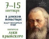 7 сентября 2019 года по благословению Святейшего Патриарха Московского и всея Руси Кирилла из Симферополя в Донской ставропигиальный мужской монастырь г. Москвы будет принесен ковчег с частицей мощей святителя Луки (Войно-Ясенецкого), исповедника, архиепископа Симферопольского и Крымского.