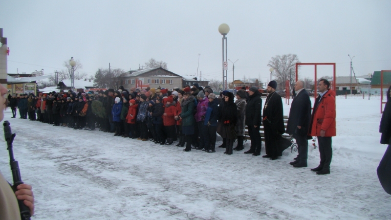 Иеромонах Мелхиседек объяснил слова гимна России «Россия Священная Наша Держава», он поведал присутствующим о жертвенной любви своих героев к нашему Отечеству и сказал: «Хочу сказать и о том, о чем ныне говорить не модно, но без чего России не выжить и не возвыситься – о геройстве, подвижничестве и подвиге. Герои и подвижники самим фактом своего существования очищают жизненное пространство от демонических, разрушительных сил, низменных мыслей и деяний. Мы должны добиться того, чтобы дети мечтали стать героями, примеряли на себя качества и героическую историю своих отцов, дедов и прадедов, свершивших огромное множество славных дел, среди которых особо возвышается Великая Победа в Великой Отечественной войне». Затем присутствующие на мероприятии возложили живые цветы к мемориальной стене с именами героев-земляков и почтили их память минутой молчания.