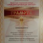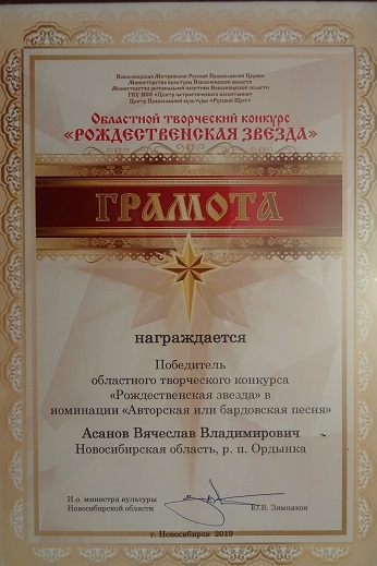 23 декабря/понедельник. В областном творческом конкурсе «Рождественская звезда» принял участие музыкальный коллектив Никольского храма р. п. Ордынское под управлением Асанова Вячеслава Владимировича.В номинации «Авторская или бардовская песня» наши прихожане заняли первое место.
