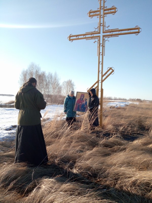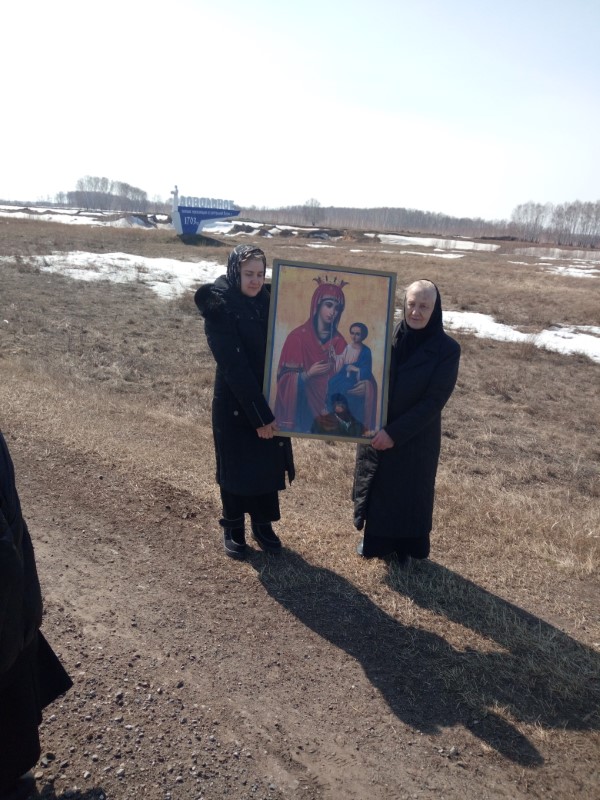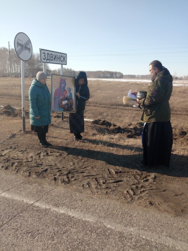 По благословению Преосвященнейшего Филиппа мы совершили крестный ход с Иверской иконой Божией Матери, обходя села Здвинск и Довольное, окропляли святой водой и обращались к Богу с молитвой о прекращении губительного поветрия.